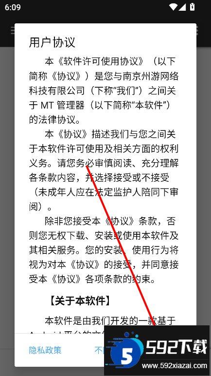 <a href='https://www.592xiazai.com/tags/1.html' target='_blank' class='keylink'>1、在本站下载并完成mt管理器官方版的安装,启动应用后点击已阅读并同意选项。