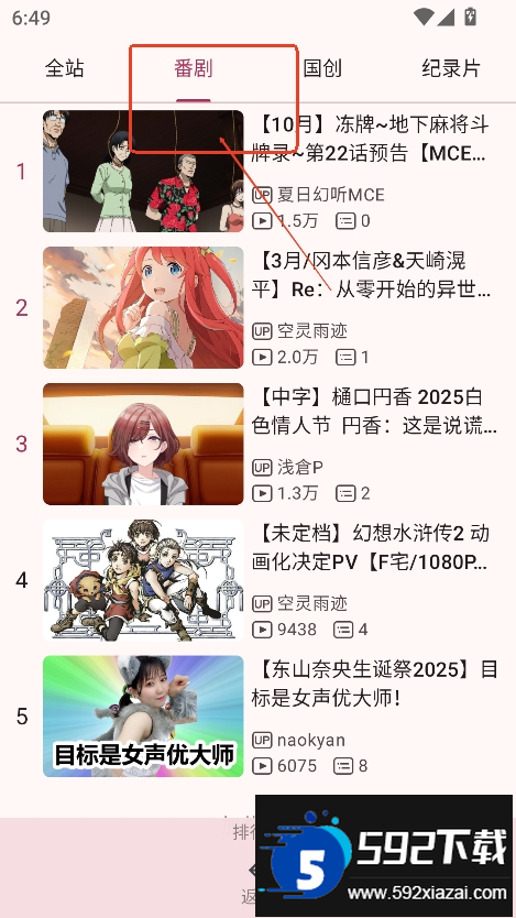 2. 可进入排行榜页面,切换到番剧分类,查看近期热门作品;