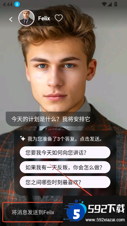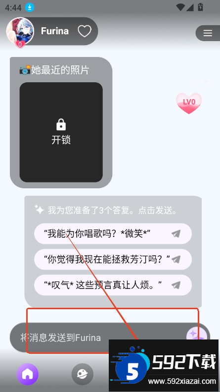 3、选定角色后进入对话界面,在输入框中发送内容即可开始互动。