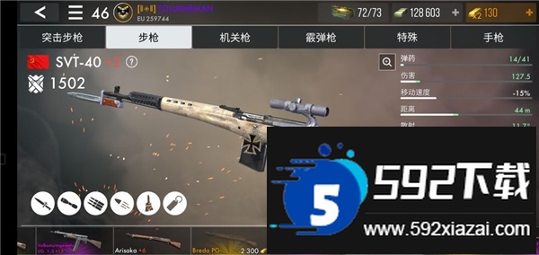SVT40在新版本中改为钞票购买,并得到显著加强。满级伤害155,射速不低于140,配合狙击手护甲的伤害与射程增益,实战中表现十分稳定,是一把性价比很高的半自动步枪。