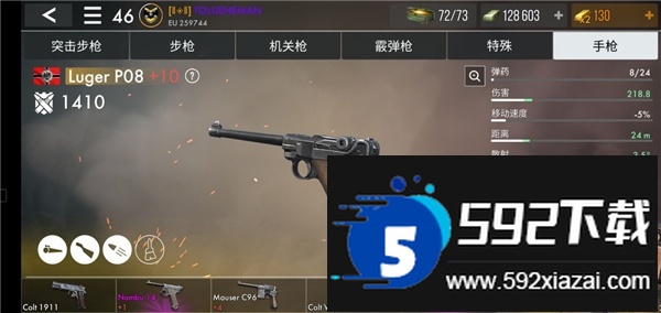 LugerP08在版本更新后强度提升,满级伤害约230,配合狙击手手枪40%伤害加成,移动轻快,适合游击与偷袭战术。