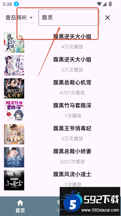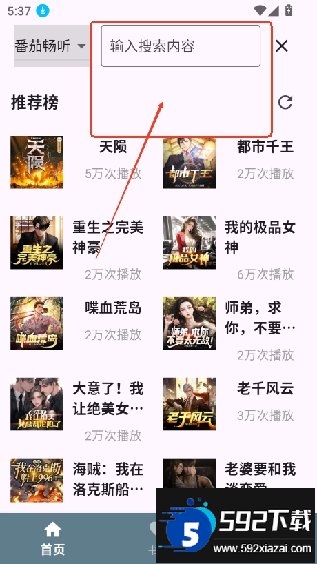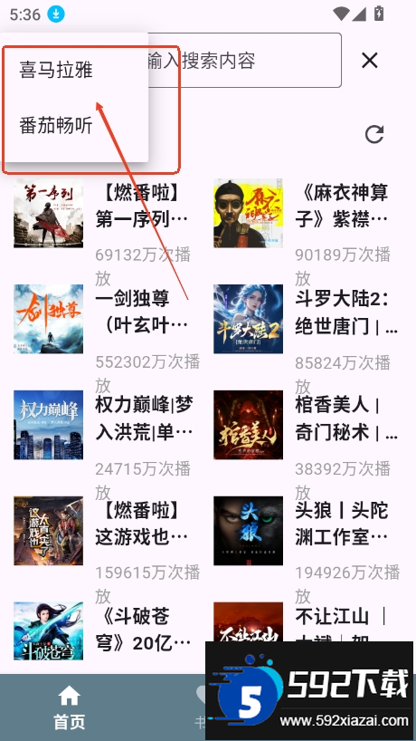 1、打开吾爱听书app首页,可自由切换番茄畅听或喜马拉雅书源,获取更多内容;