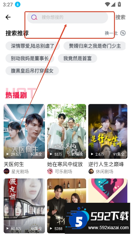 2、也可以直接点击顶部搜索栏,输入短剧名称或演员名字进行查找;