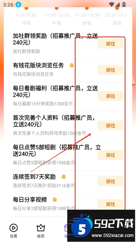 2、页面往下滑动,会出现多种视频任务,选择任务点击前往完成,即可兑换相应红包。
