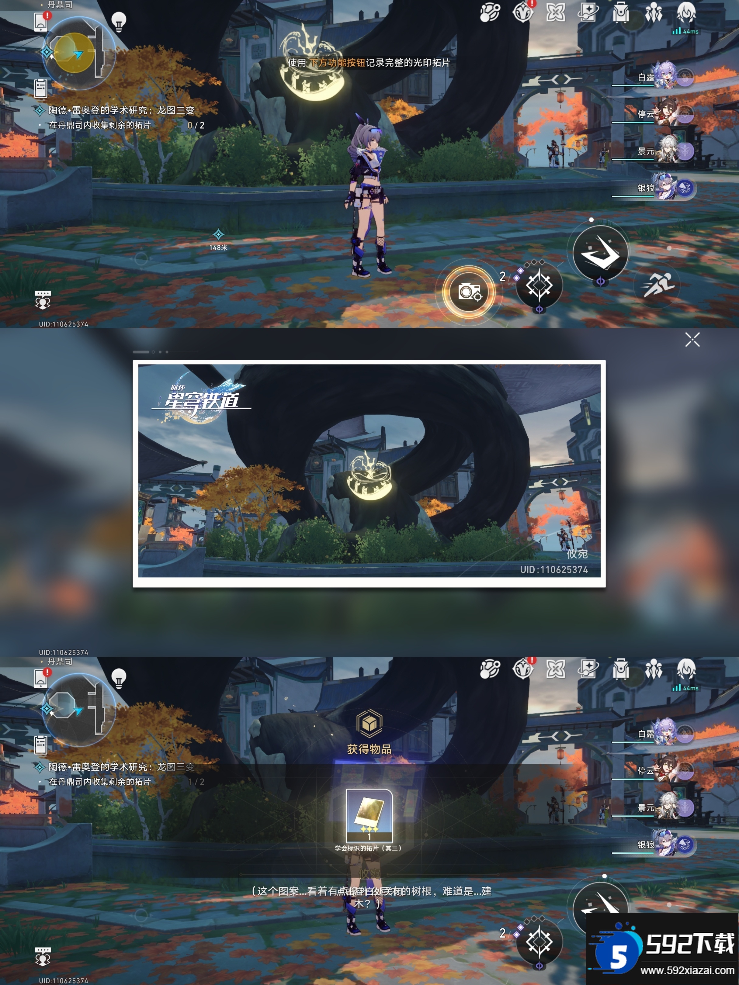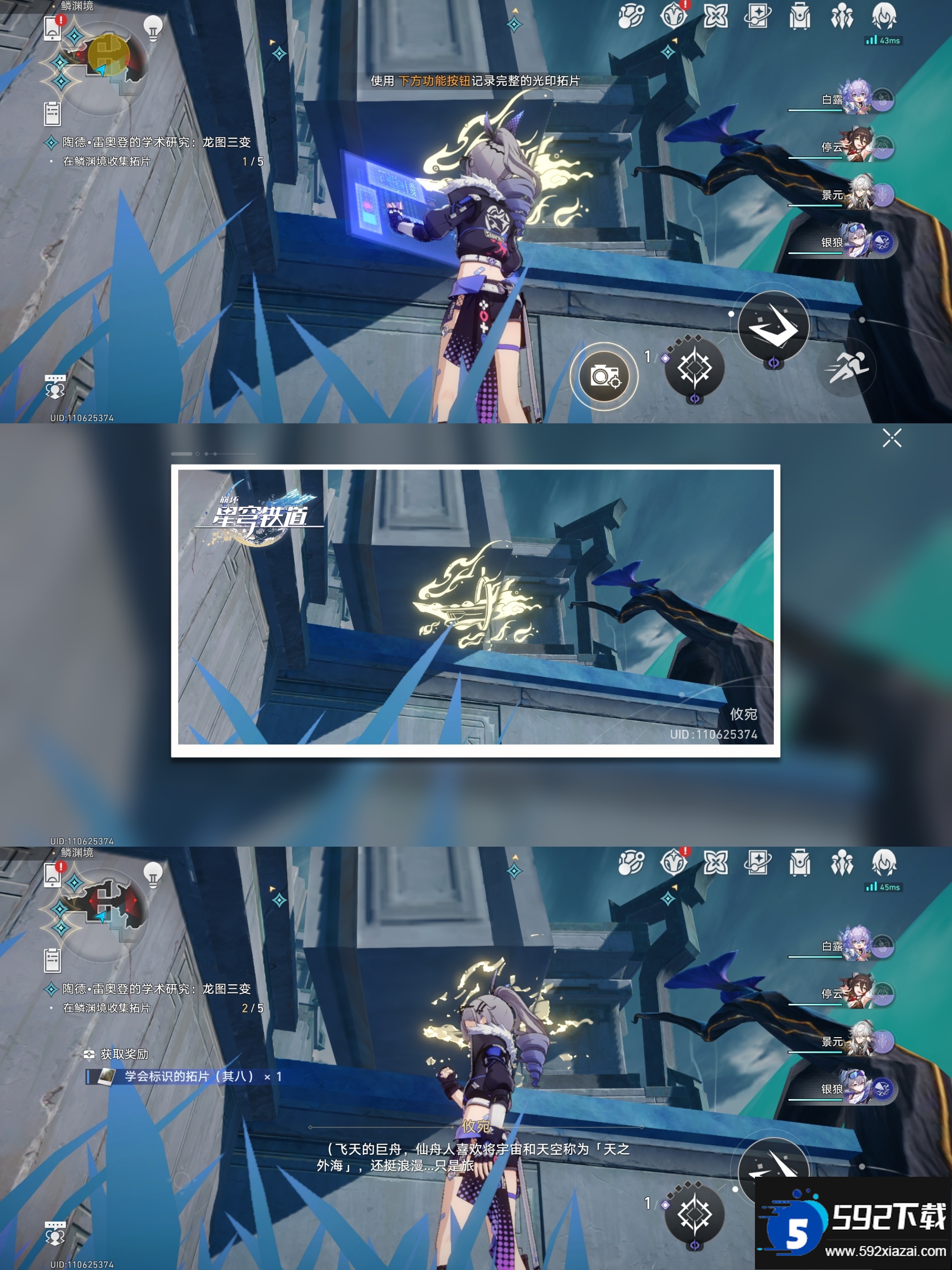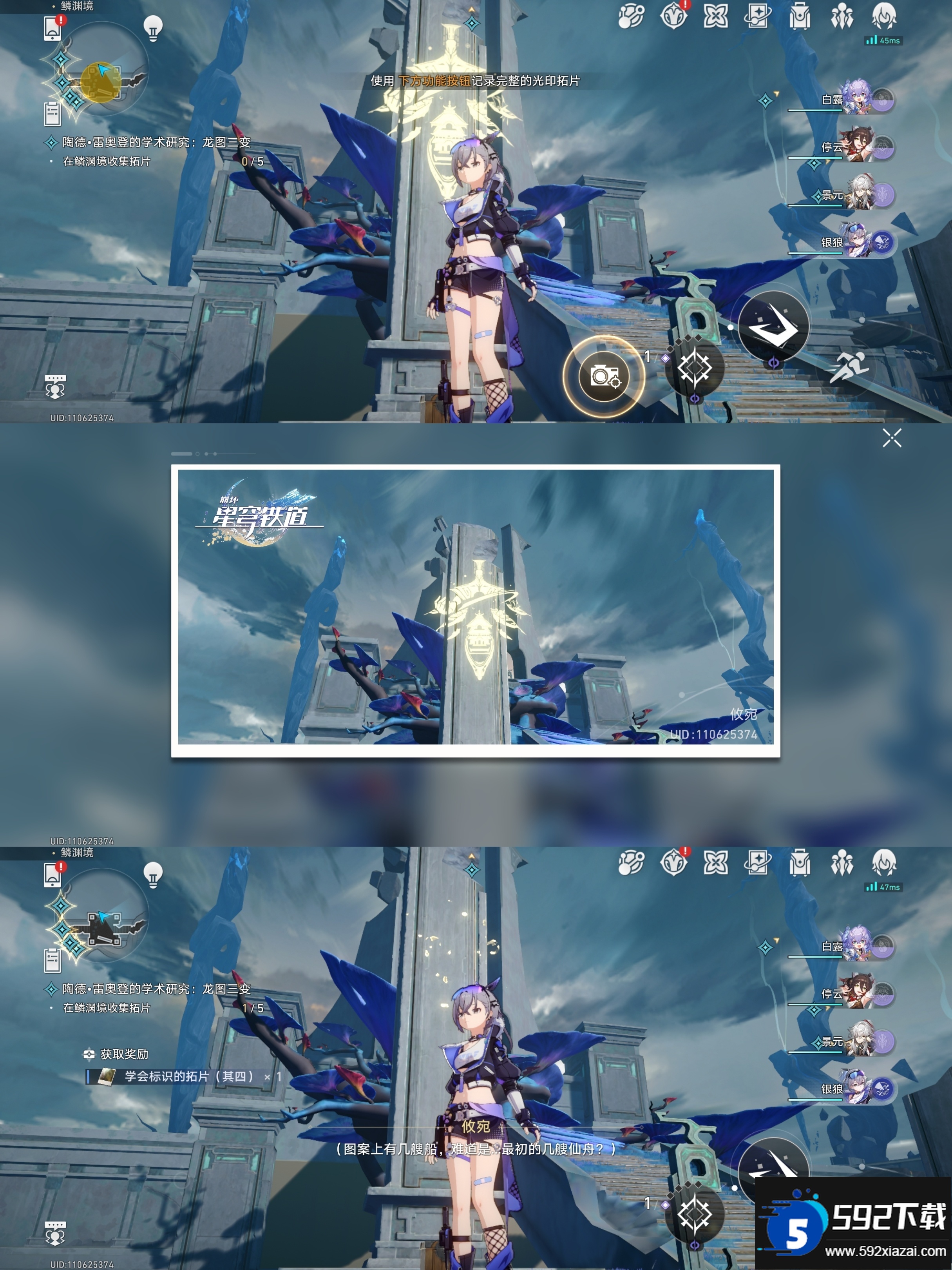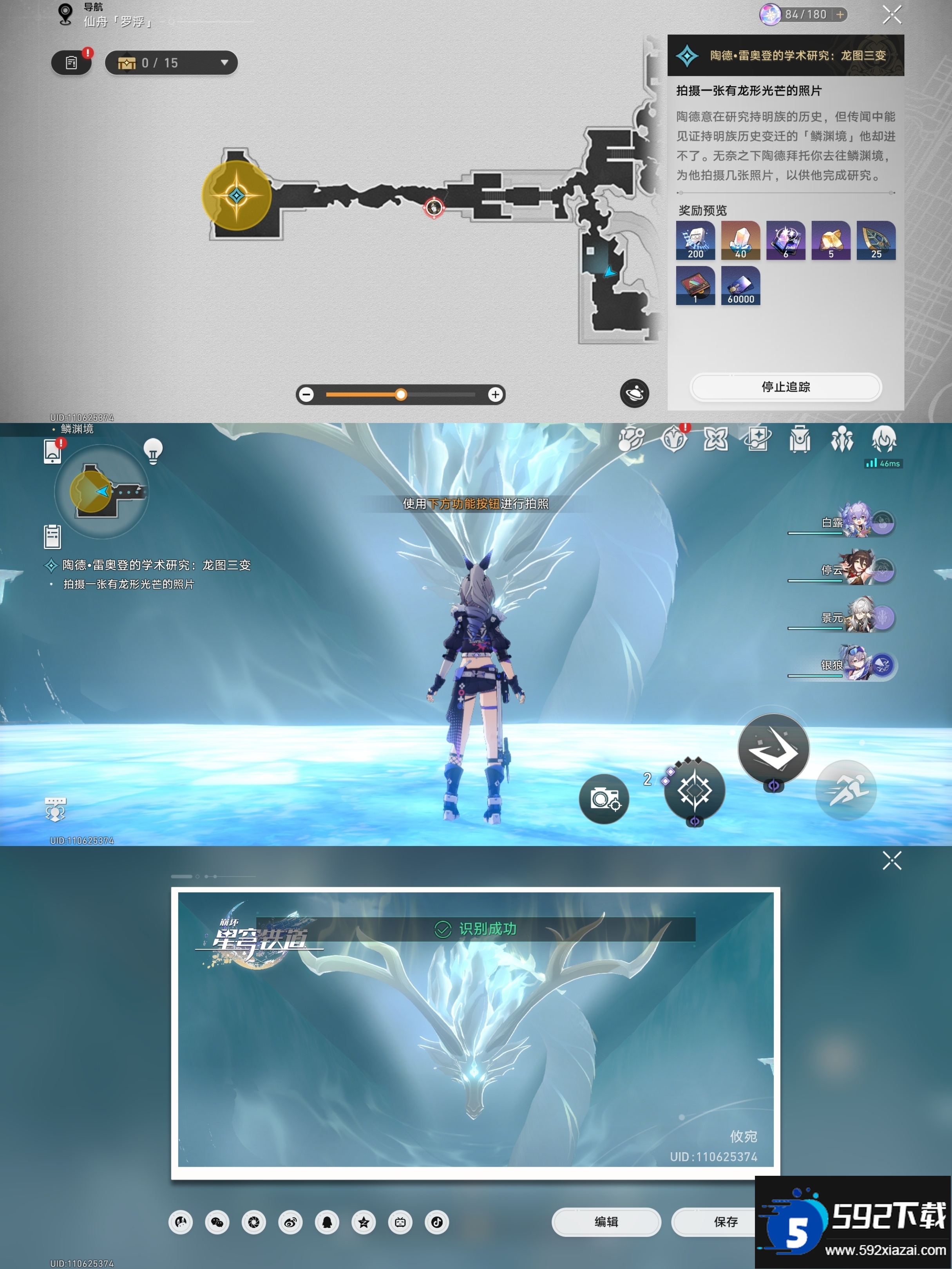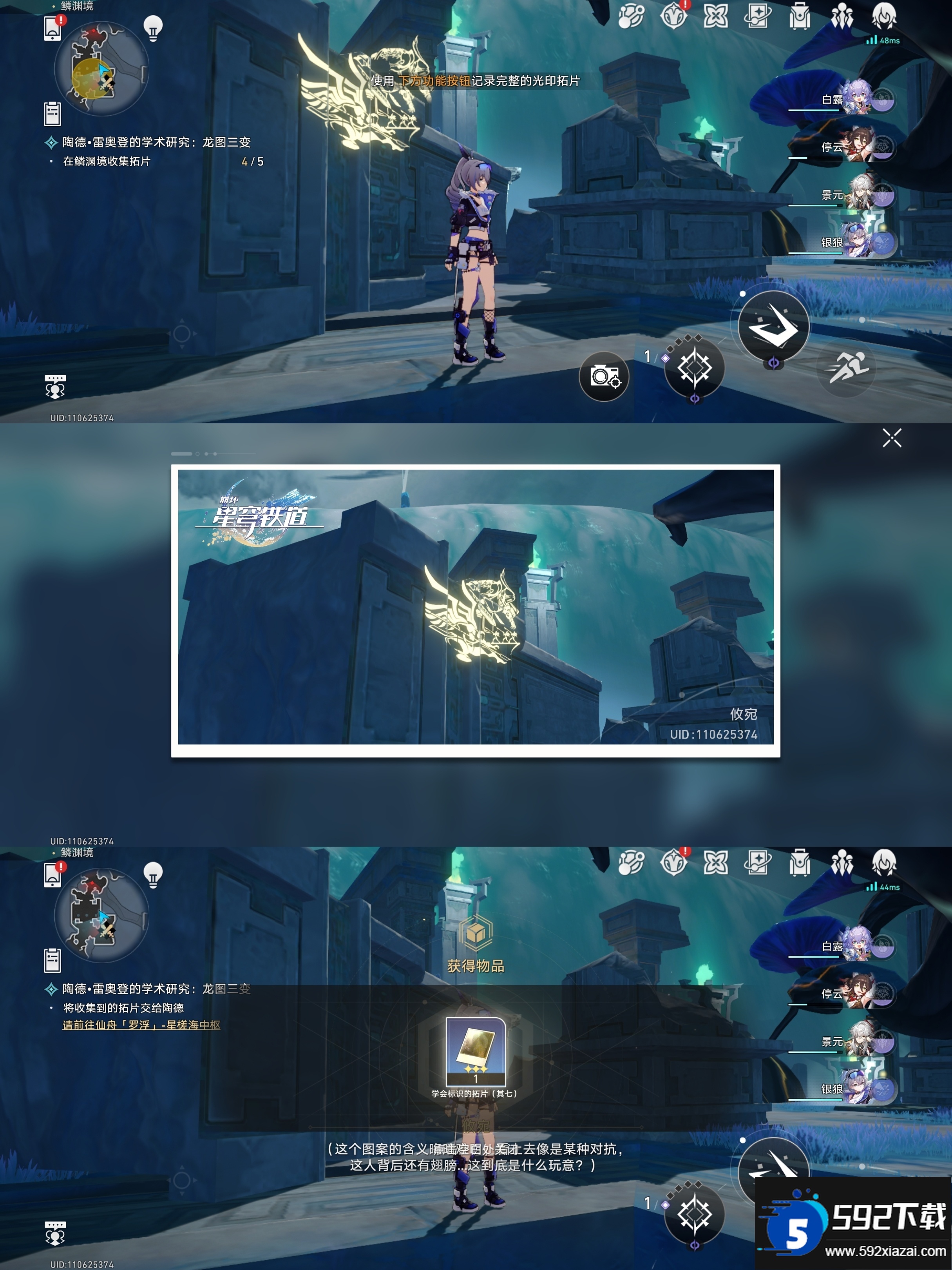 根据指引依次拍摄龙尊雕像、历史壁画、持明卵与龙形光芒。