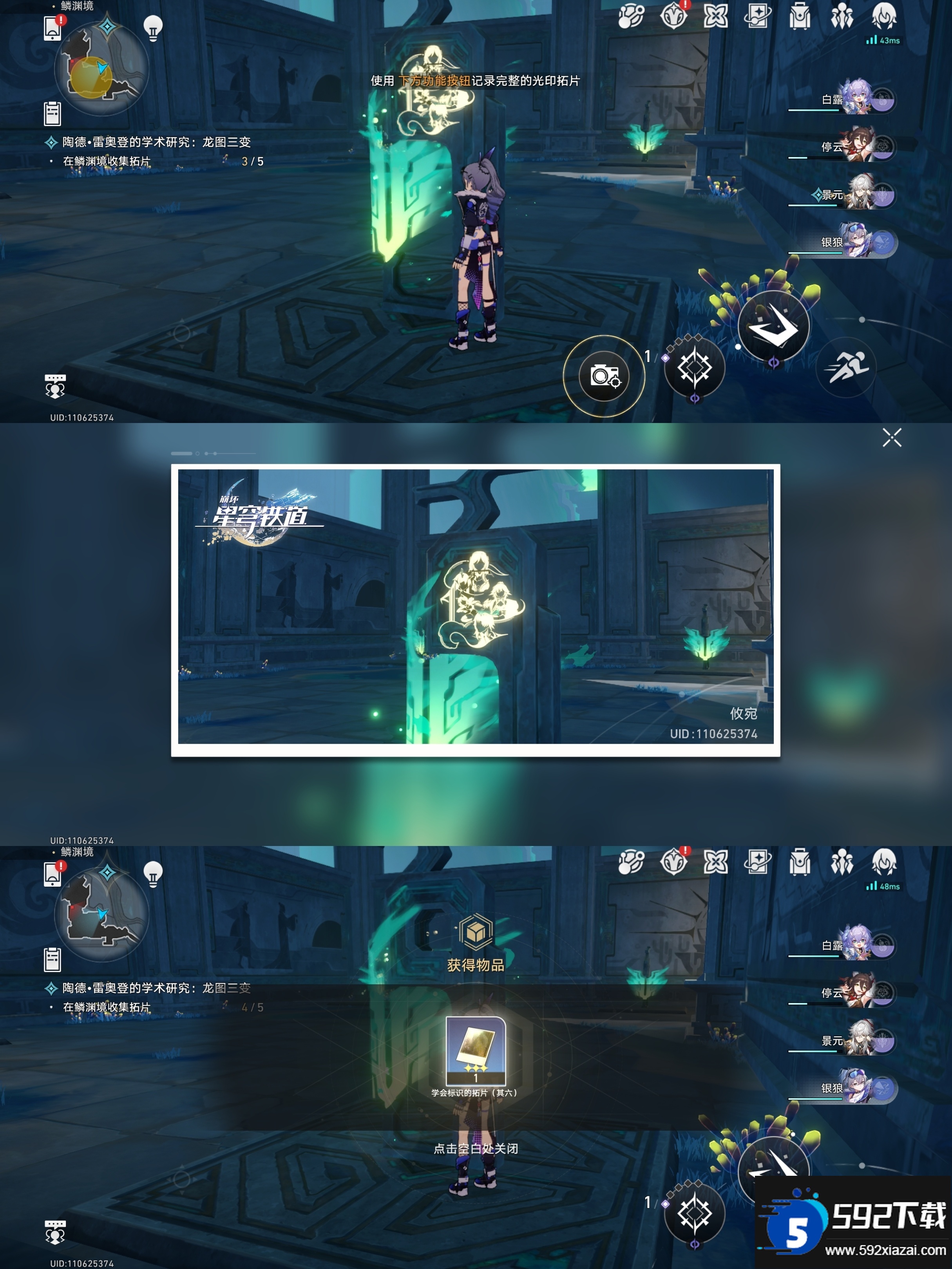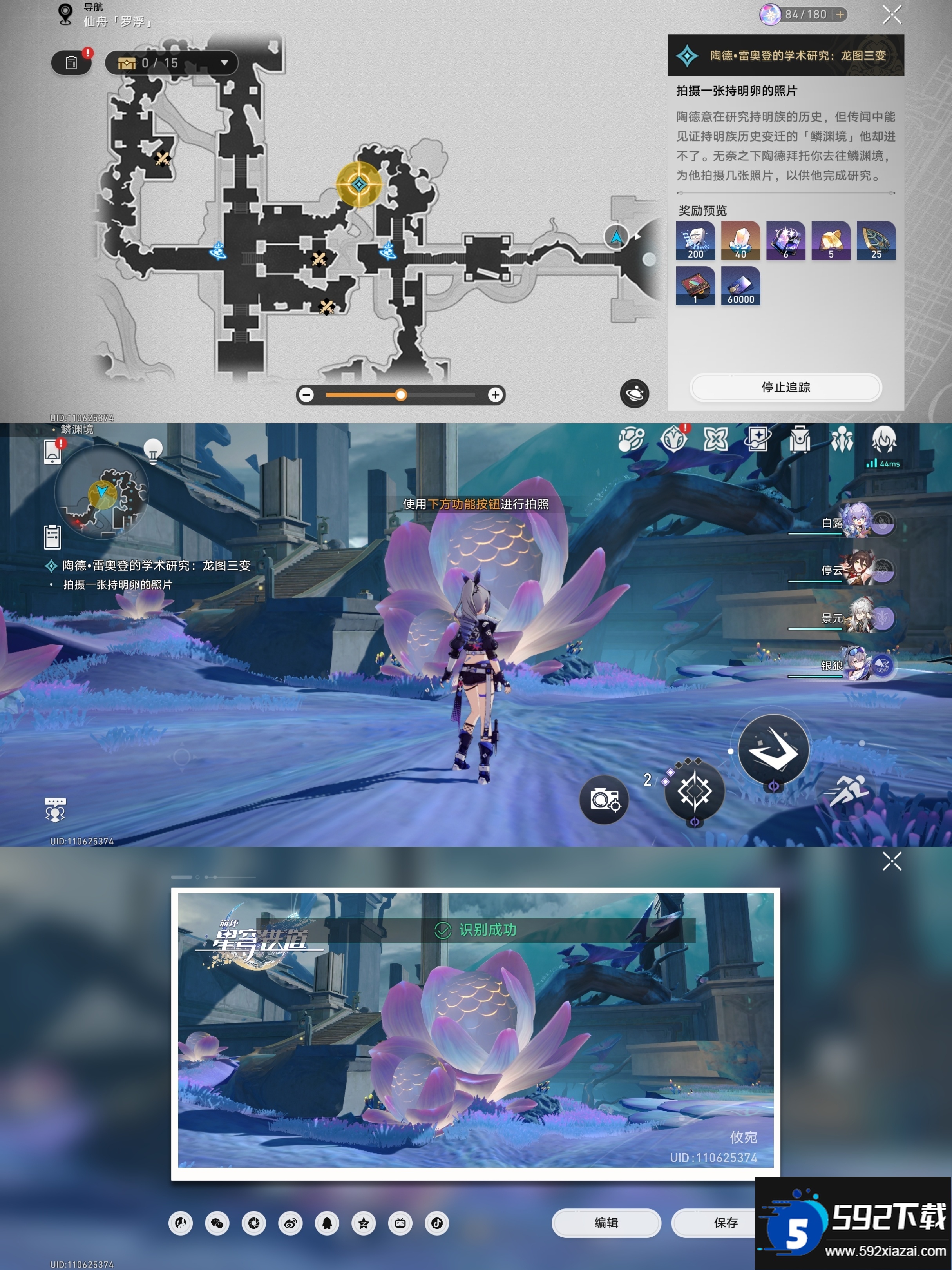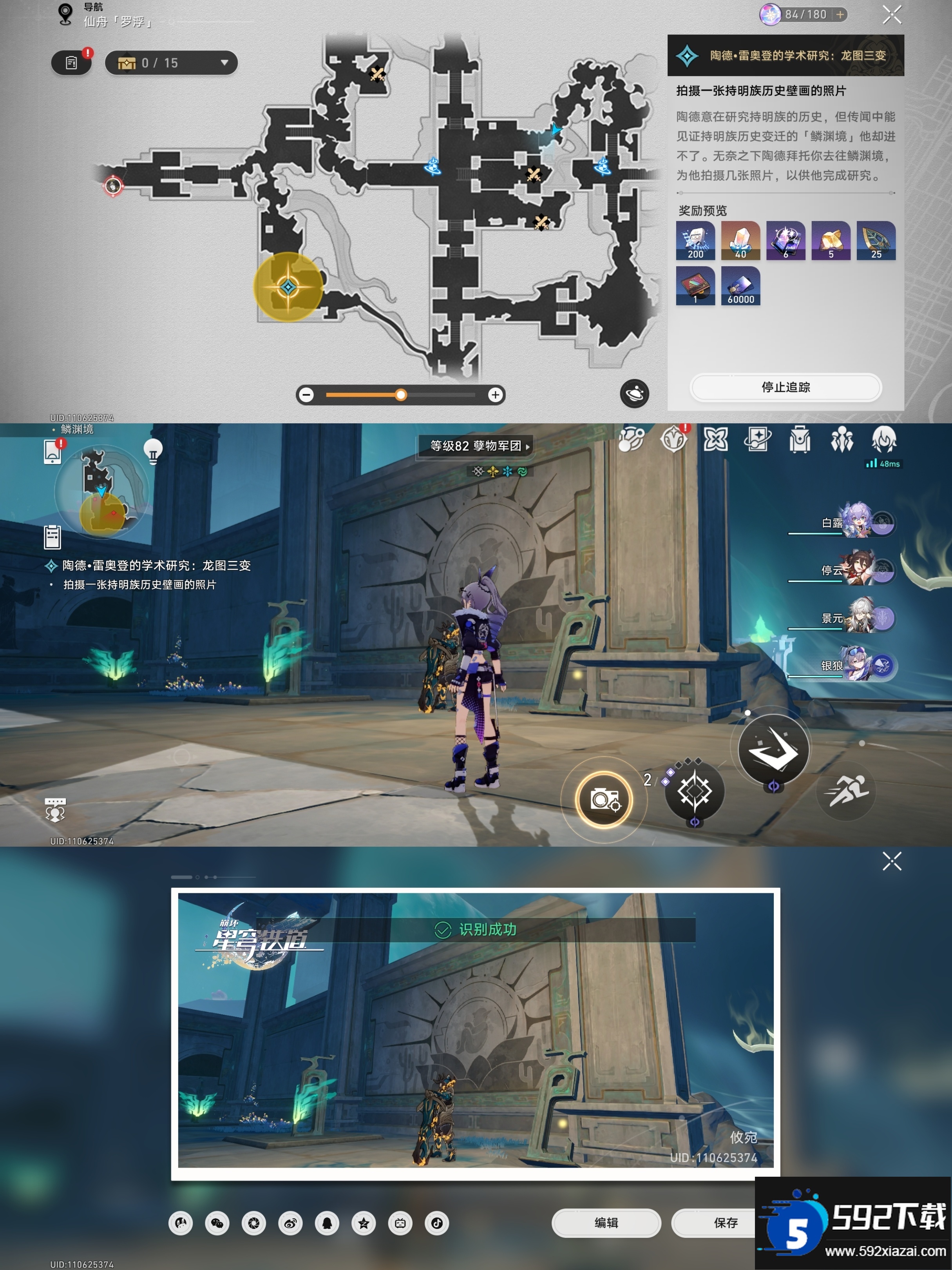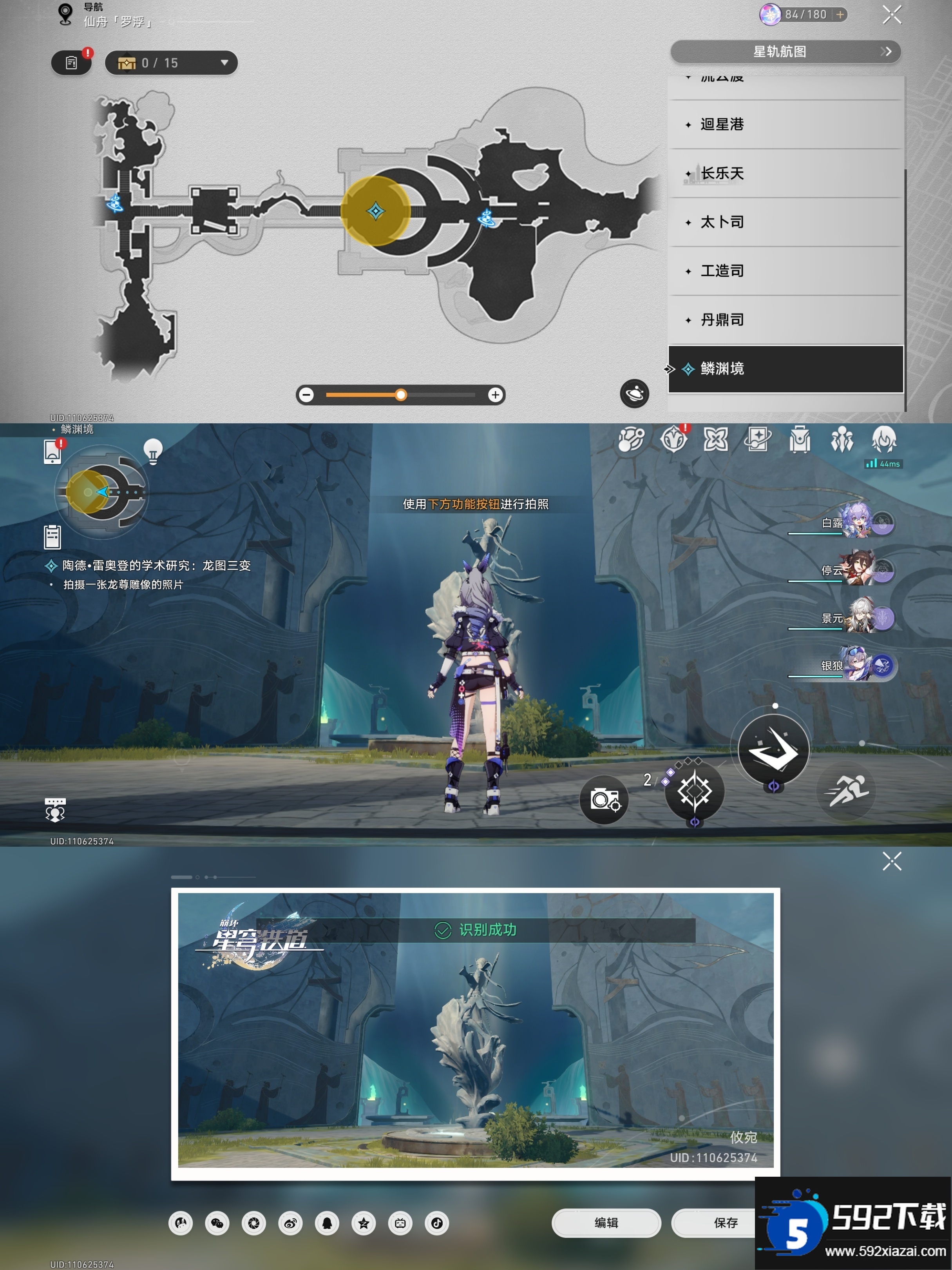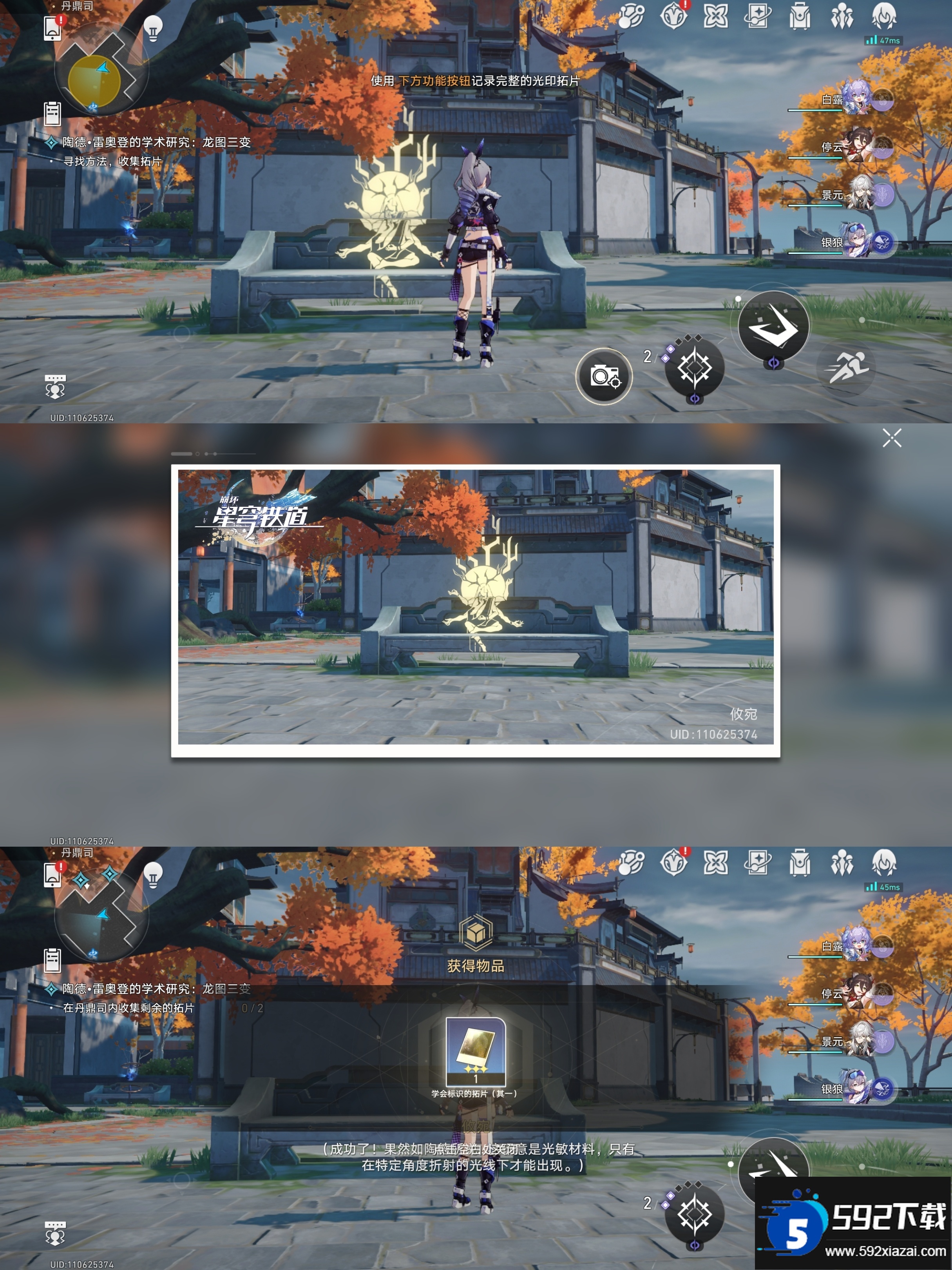 根据指引依次拍摄龙尊雕像、历史壁画、持明卵与龙形光芒。