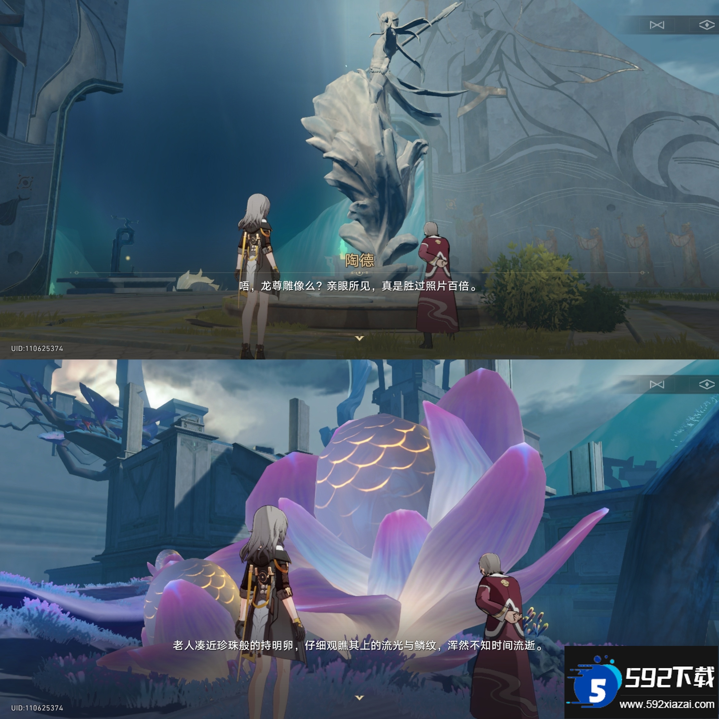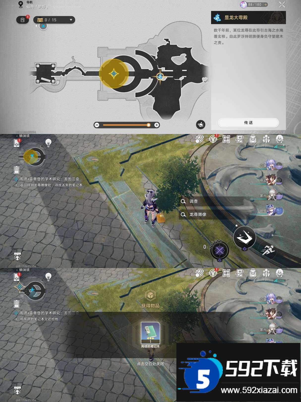 带领陶德参观龙尊雕像与持明卵,途中发现其遗失的笔记本。