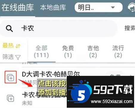 在曲库中寻找到想演奏的歌曲后,点击歌曲左侧的加号即可将其加入播放列表。