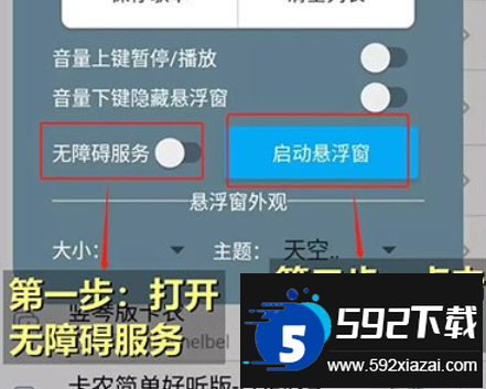 添加歌曲完成后,点击界面右下角的圆形启动按钮,进入播放列表页面。首先打开无障碍服务开关,点击后会跳转到手机辅助功能设置页,找到本软件并开启相应权限;接着点击启动悬浮窗按钮,首次使用将引导你授予悬浮窗权限,此操作只需设置一次。