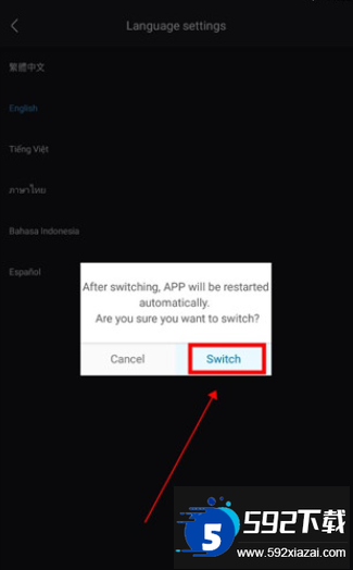 5、弹出确认窗口后,点击右侧【Switch】切换按钮,应用将自动重启并完成语言设置。