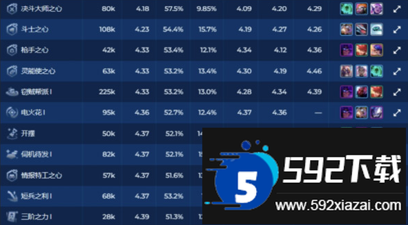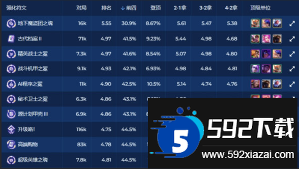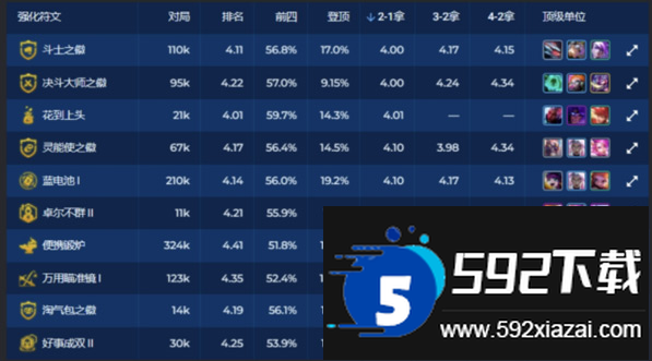 骰子、决斗之冕与黄金门票这三个强化也属于开局优选,在2-1阶段选择的平均排名较高。骰子本赛季玩法多样,主流用法包括4级骰怪兽或操作青钢影、德莱文等容易骰出的阵容;决斗之冕过渡舒适,虽难争第一但容易获得名次;黄金门票适合连败玩超英系赌狗阵容,或利用高经济玩独家三费阵容。