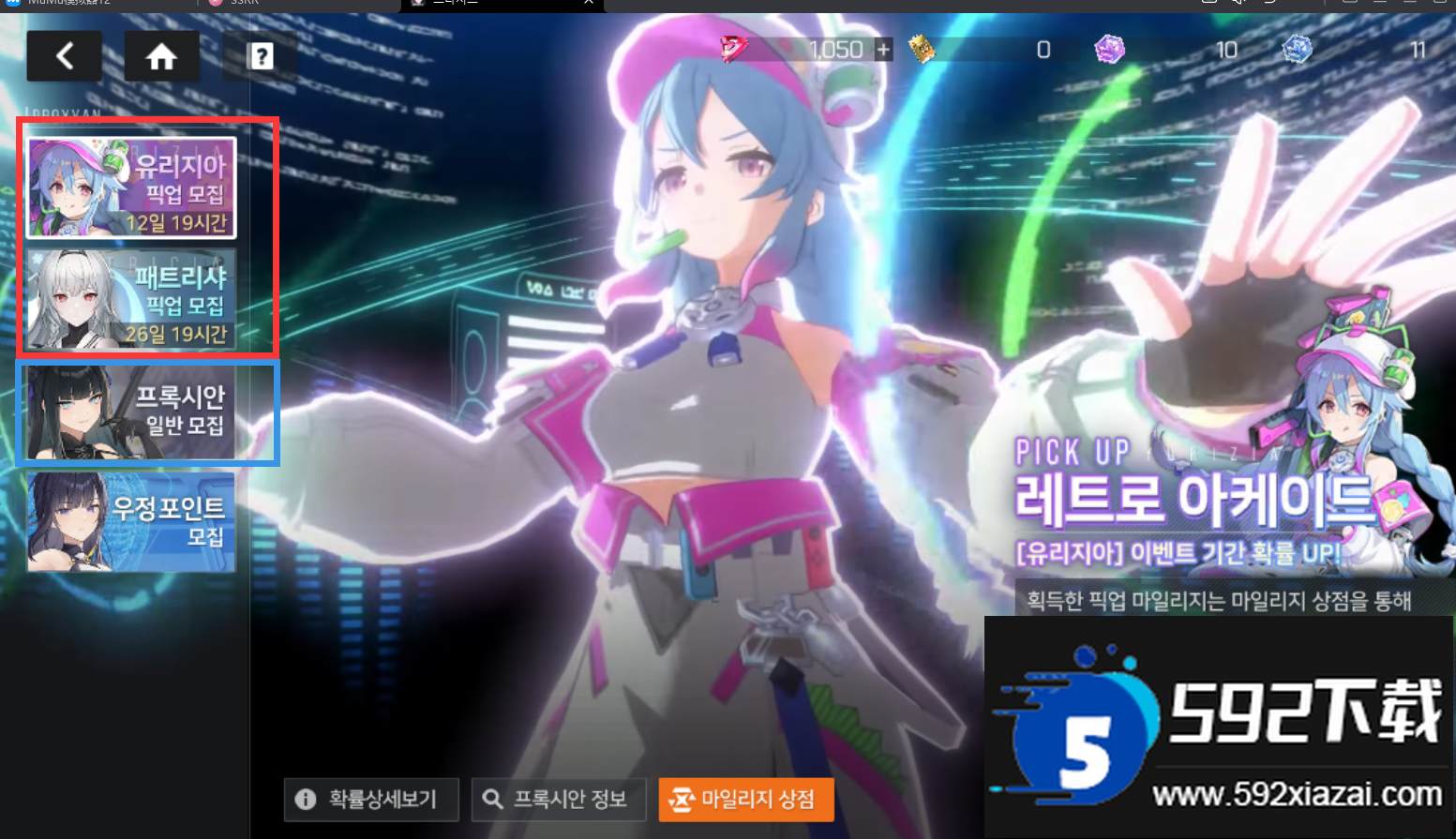 图中红框为限定卡池,使用抽卡石头抽取;蓝框为常驻卡池,使用常驻抽卡券抽取。