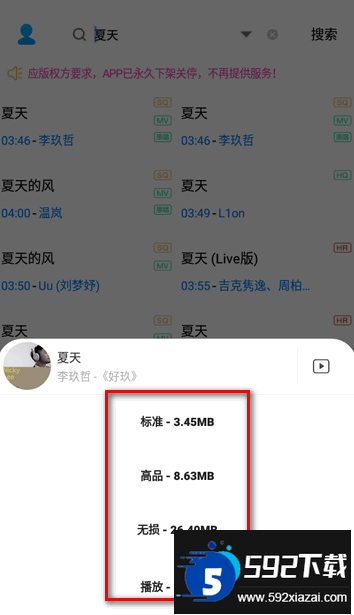 3. 点击音质选项,在标准、高品和无损等格式中做出选择。