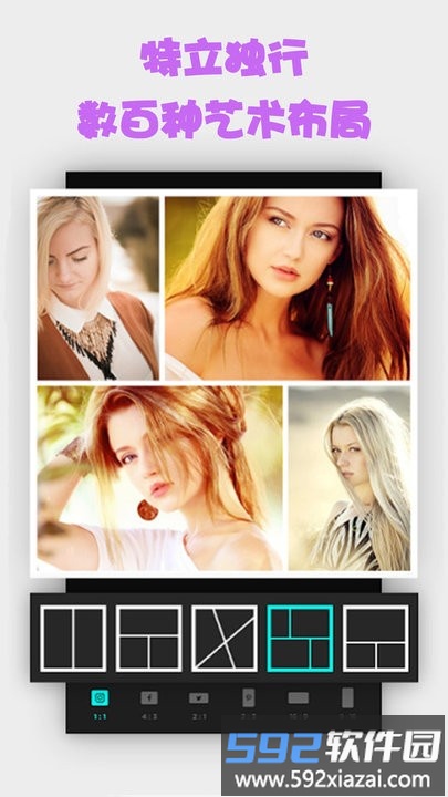 拼图组合:多样化的版式模板让图片编排更有趣,内置渐变纯色背景与风格化背景图库