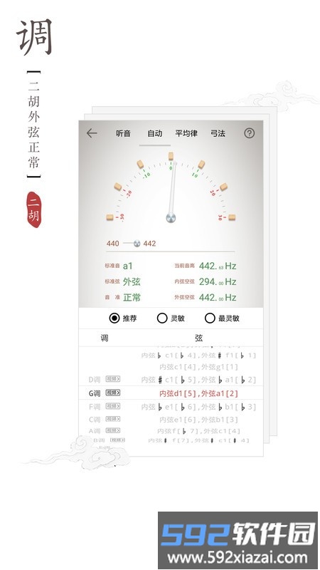 “二胡调音器”专为胡琴类民族乐器设计,通过真实音色采样与智能分析技术,实现快速精准的弦音校准。