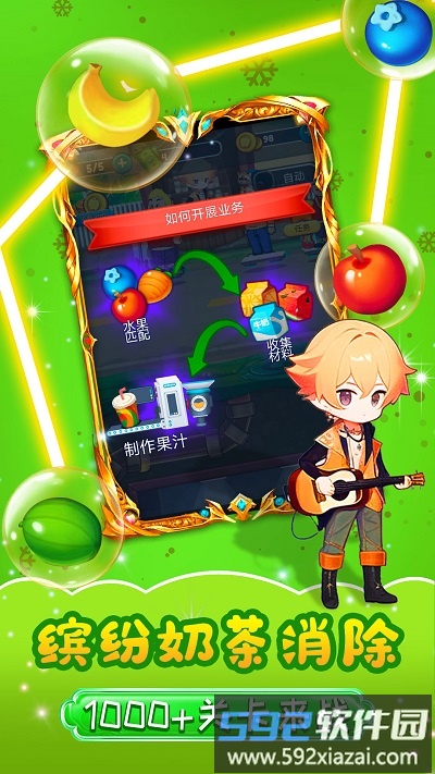 这款消除游戏带来新鲜体验,玩家通过指尖滑动完成水果消除任务。每通过一个关卡都能解锁经营资金,用来升级你的奶茶工作台。界面操作简单流畅,无论何时打开手机都能享受闯关乐趣。