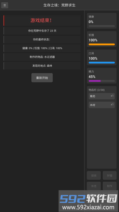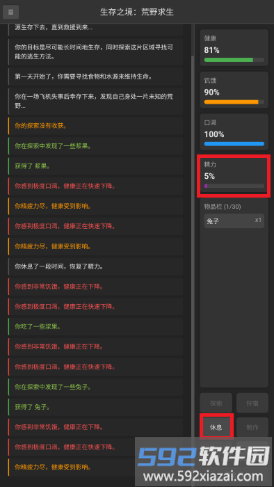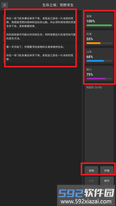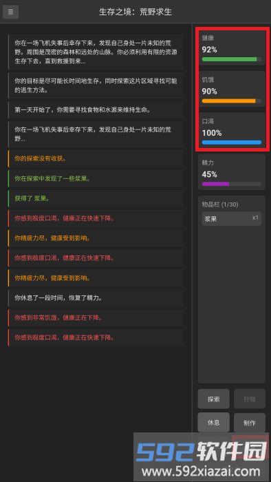 生存之境荒野求生将生存体验浓缩进简洁的界面——左侧流动的文字是你与荒野对话的窗口,所有遭遇与转折在此展开;右上方状态栏无声记录着你逐渐消逝的生命体征;底部操作区则是你对抗死亡的全部武器。