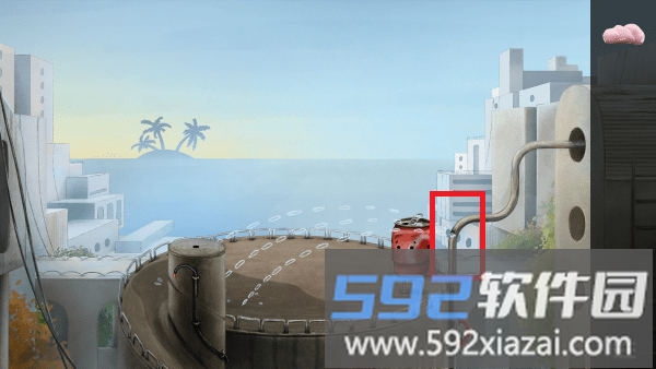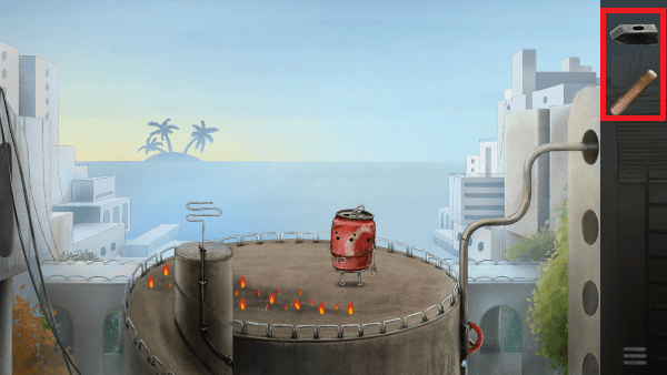 接着选中锤子工具,对着画面中破损的水管敲击一下,水流会喷涌而出,浇灭附近的火焰。