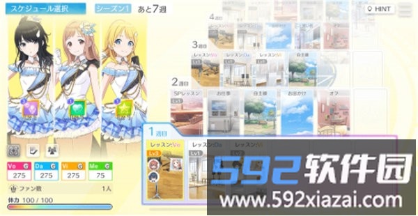 获得偶像后即可开启培养计划。组建专属团队后,需要规划7周×3季度的训练方案。通过合理安排日程提升能力值,收集制作人卡片,搭配专属卡组迎接甄选挑战。