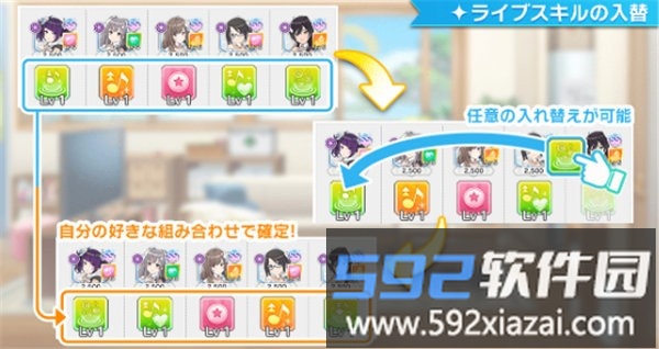所有偶像的技能都可以重新随机获取,方便你打造理想阵容。将培养成熟的偶像编入队伍即可参与现场演出。合理搭配团队能激活特殊演出技能,向更高分数发起冲击。