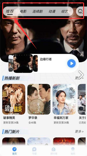 2、在首页浏览推荐、电影或剧集等分类入口,帮你迅速锁定想看的节目。