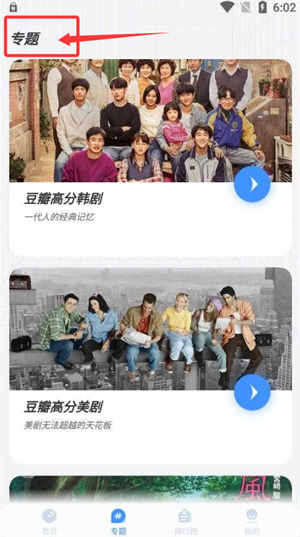3、跳转到专题板块,这里准备了高分韩剧、人气美剧等各类主题片单。