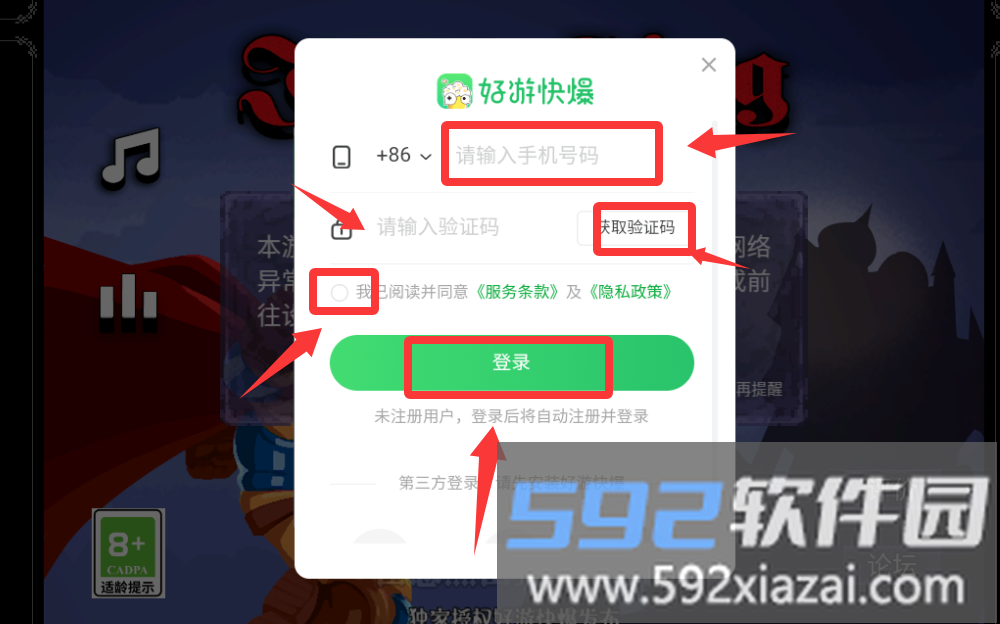 3、先在红色方框内勾选同意选项,接着输入手机号获取验证码,填写正确信息后即可登录。